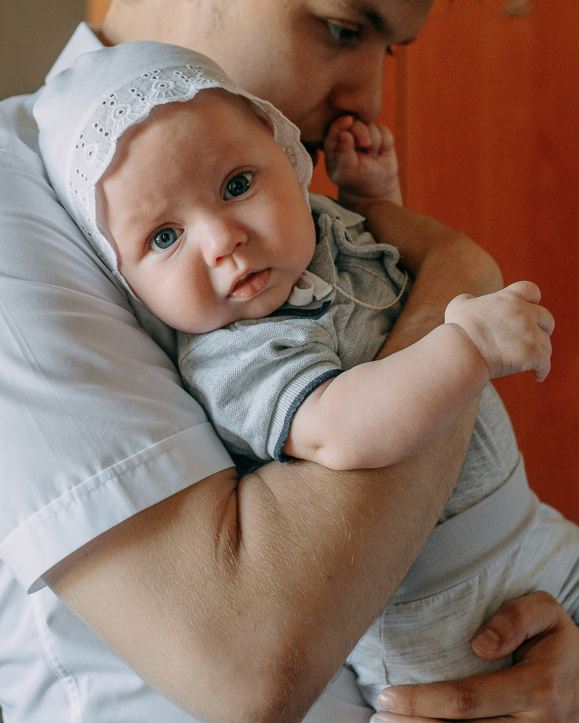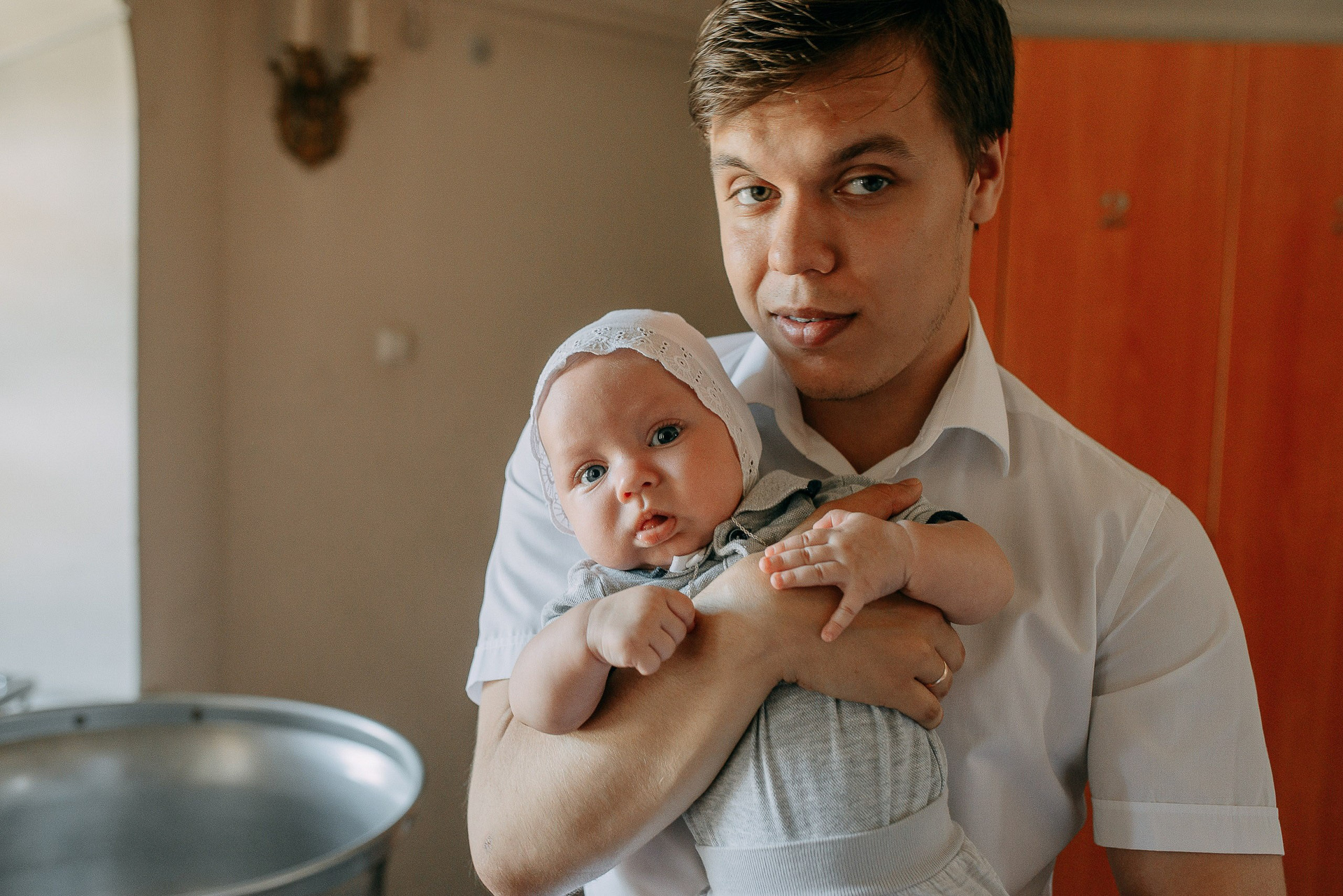 - Репортажный стиль: Съемка велась максимально деликатно, без использования вспышки, чтобы сохранить таинственную атмосферу церкви и не тревожить 4-месячного героя дня.